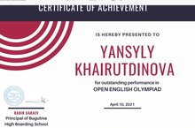 10 апрель көнне 6 сыйныф укучысы Хәйретдинова Я.С. беренче тапкыр инглиз теле буенча зона олимпиадасында катнашып, инглиз телен яхшы белүен күрсәтте.(Җитәкчесе Зыятдинова А. Ф). Киләсе олимпиаларда Янсылу беренче урынны алыр дип өметләнәбез. Уңышлар телибез!