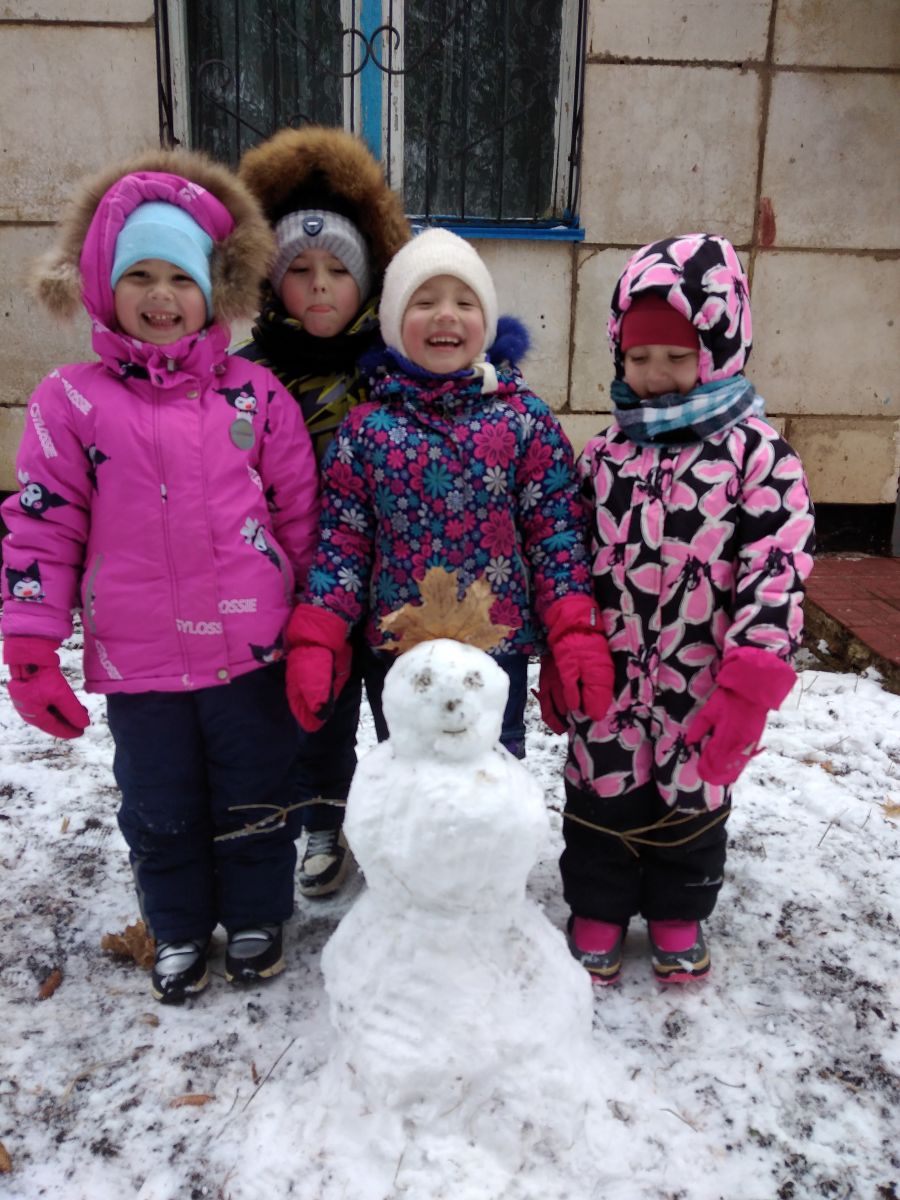 Прогулка "Вот и первый снег" Познавательно-исследовательская деятельность : снег стал влажным , липким. Из него можно слепить снежки, снеговика. Продуктивная деятельность : слепили снеговика.