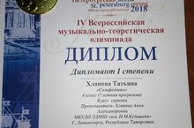В Санкт - Петербурге прошла IV Всероссийская музыкально-теоретическая олимпиада, где Дипломантом I степени по сольфеджио стала ученица 4 класса Хлапова Татьяна (преп. Хлапова А. А.). Поздравляем!!!