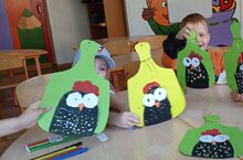 Роспись разделочных досок с дошкольниками - отличный творческий, развивающий и увлекательный процесс. Он помогает детям развивать мелкую моторику, творческое мышление и навыки работы с гуашью и инструментами. Для росписи доски, ребята группы раннего развития «Пчёлки» использовали простые геометрические формы, которые легко воспроизвести. Курица пеструшка – забавный и интересный сюжет для росписи кухонной утвари, который очень понравился детям дошкольного возраста.