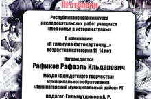 Обучающийся Дома детского творчества, объединения "В краю родном" Рафиков Рафаэль, под руководством педагога дополнительного образования Гильмутдиновой А.Р. принял участие в Республиканском конкурсе исследовательских работ "Моя семья в истории страны" и стал дипломантом III степени в номинации "Я гляжу на фотокарточку...". Молодец! Поздравляем!