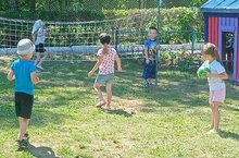С началом летнего оздоровительного сезона многие занятия перенеслись на прогулочные участки. Особенно целесообразно сейчас проводить занятия физической культурой на свежем воздухе. В рамках цикла занятий по физическому развитию "Спортивные игры" мы с детьми старшей и средней группы стали осваивать командные спортивные игры. В данное время мы развиваем навыки игры в волейбол. Игра в волейбол универсальа, так как способствует не только развитию физических качеств (быстрота, ловкость, сила, выносливость), но и личностных качеств (умение действовать в команде, сопереживать, ставить цели и достигать их). Сегодня состоялся пробный матч, в котором ребята смогли почувствовать себя настоящими игроками. Многих из них игра очень заинтересовала, что они стали отрабатывать впоследствии подачу и технику ловли мяча.