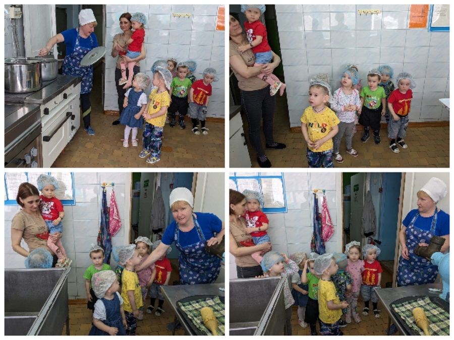 Сегодня дети младшей группы побывали на кухне детского сада, где наблюдали за процессом приготовления пищи.