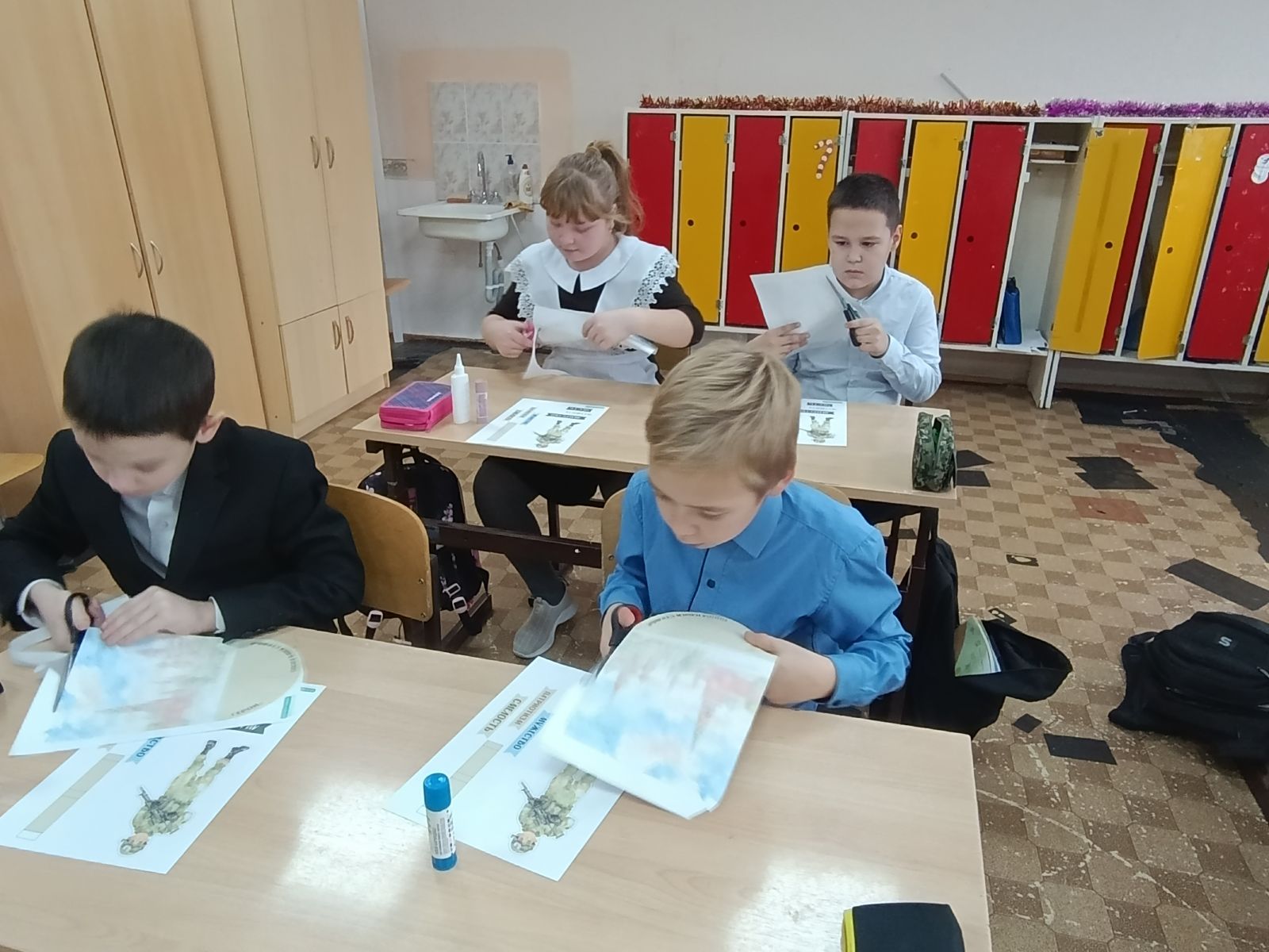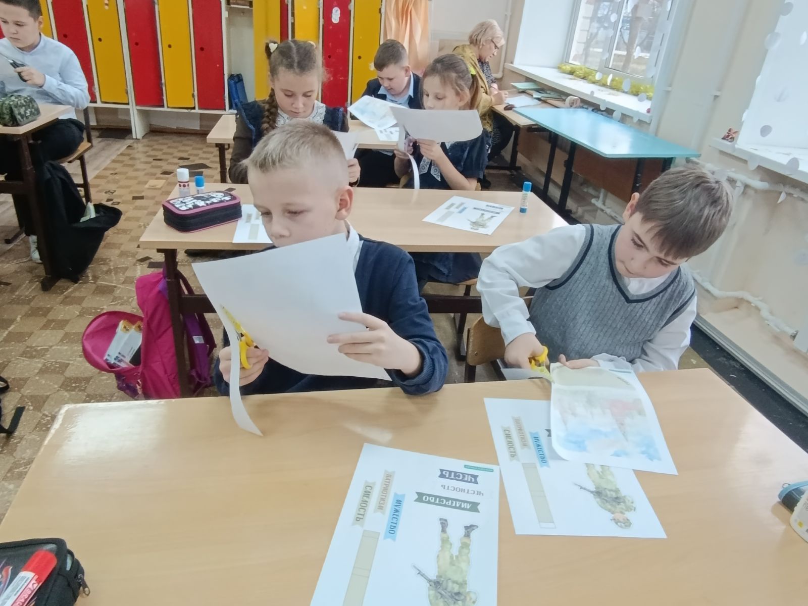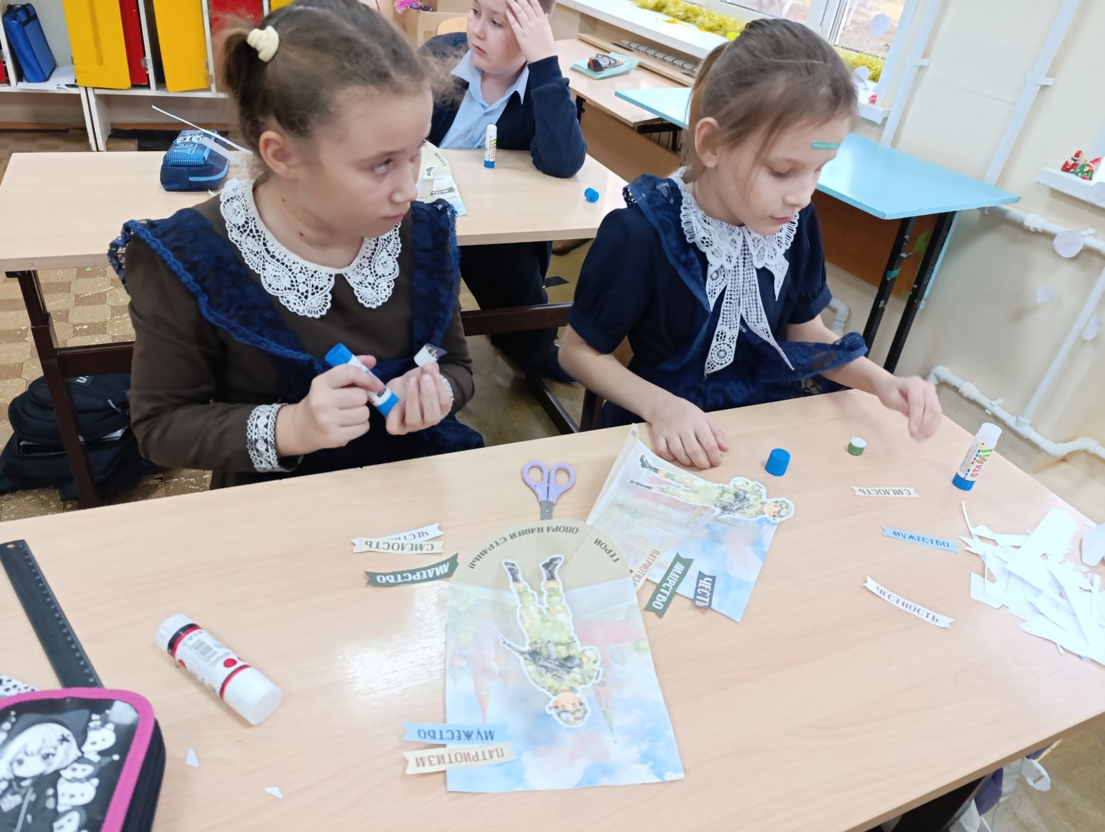 Ученики 3 класса изготовили поделки «Герои — опора нашей страны». На их поделке на фоне узнаваемого силуэта Москвы гордо стоит фигура солдата. За ним, как незыблемый фундамент, размещены главные слова-ценности: «Мужество», «Патриотизм», «Честность», «Лидерство». Эта работа наглядно и символично выразила идею о том, что настоящие герои стоят на защите не только земель, но и наших вечных нравственных ориентиров.