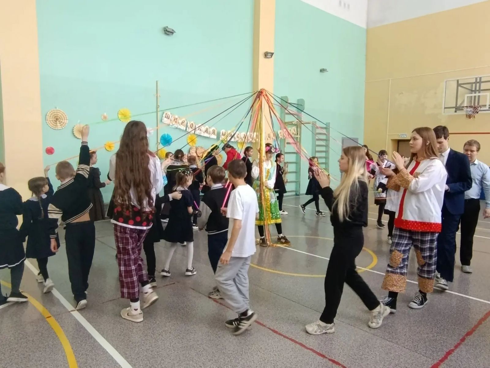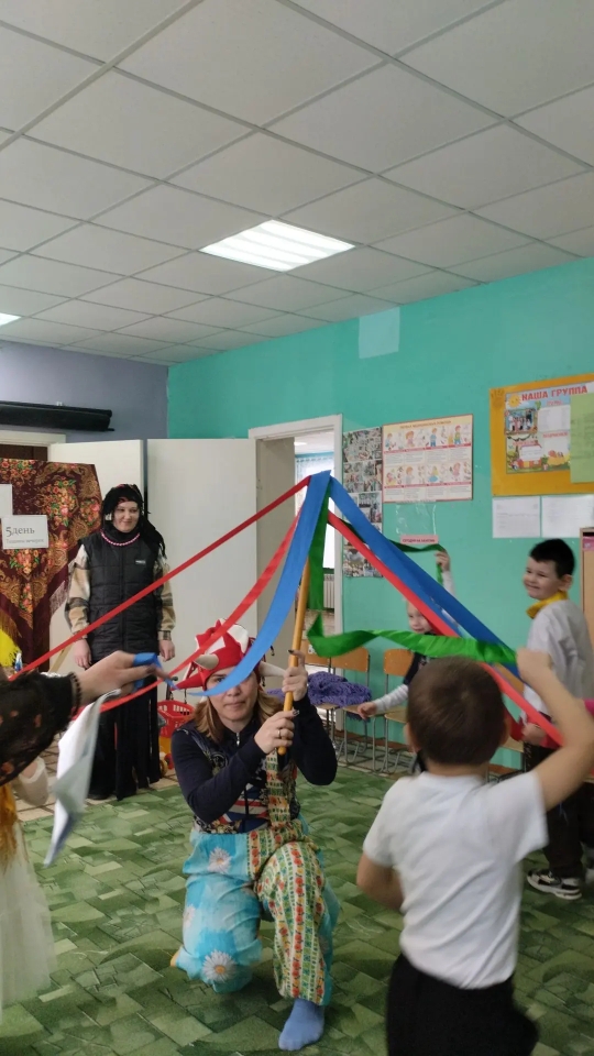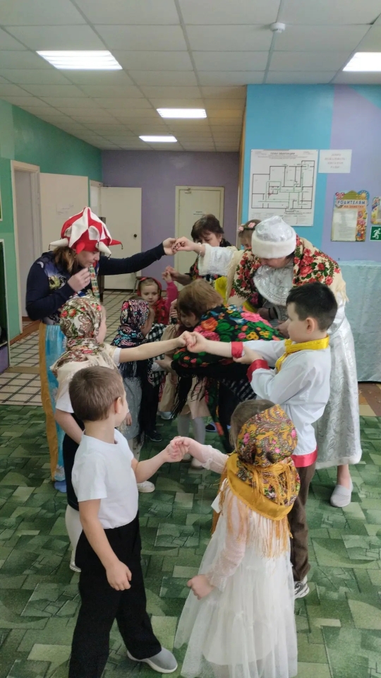 С самого начала праздника задорные скоморохи не давали скучать никому: они шутили, проводили забавные конкурсы и заряжали всех отличным настроением. Главными гостьями стали Зима и Весна: после небольшого спора Зима всё же уступила дорогу, а Весна закружила всех ребят в ярком ленточном хороводе.