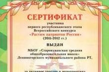 В здании «Совета ветеранов» г. Лениногорска МБОУ «Старокувакская СОШ» был выдан СЕРТИФИКАТ участника первого республиканского этапа Всероссийского конкурса «Растим патриотов России» (2011-2012 гг.) за активное участие в мероприятиях Всероссийского конкурса «Растим патриотов России», посвященного 70-летию Победы в Великой Отечественной войне 1941 – 1945 годов.