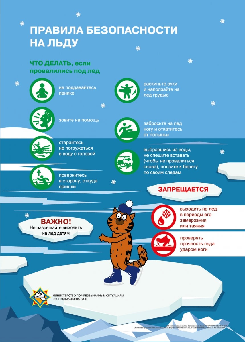 - Не выходить на лед, не проверять прочность льда ударом ноги и не кататься на плавающих льдинах и всякого рода самодельных плотах, не спускаться на санках с горы в сторону водоема.