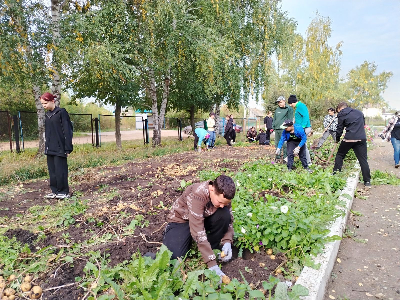 Ребята и педагоги, на пришкольном участке собирали урожай овощей, который был выращен во время трудовой практики летом. Перекапывали грядки, спиливали сухостой и облагораживали территорию