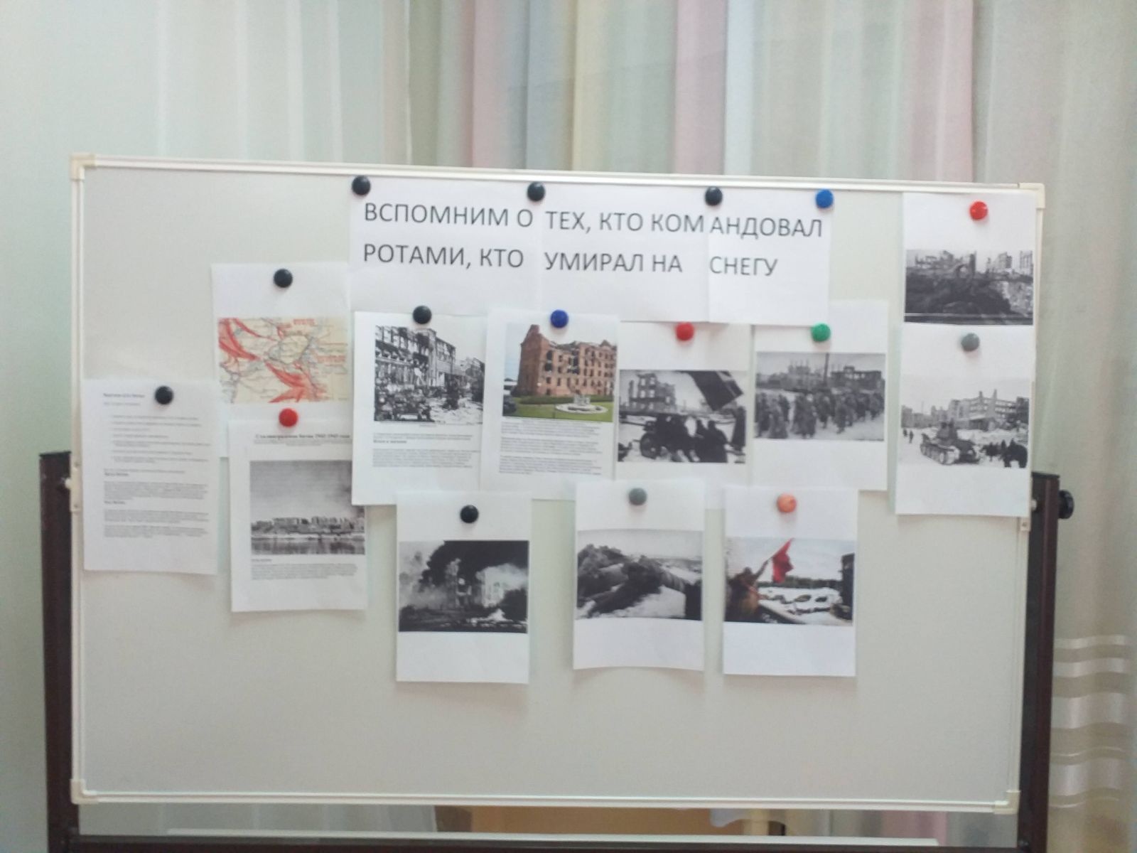 День разгрома советскими войсками немецко-фашистских войск в Сталинградской битвеДень воинской славы — День разгрома советскими войсками немецко-фашистских войск в Сталинградской битве (1943 год) — отмечается в России ежегодно 2 февраля. Он установлен Федеральным законом № 32-ФЗ от 13 марта 1995 года «О днях воинской славы (победных днях) России». В школе был оформлен информационный стенд, посвященный этой дате.