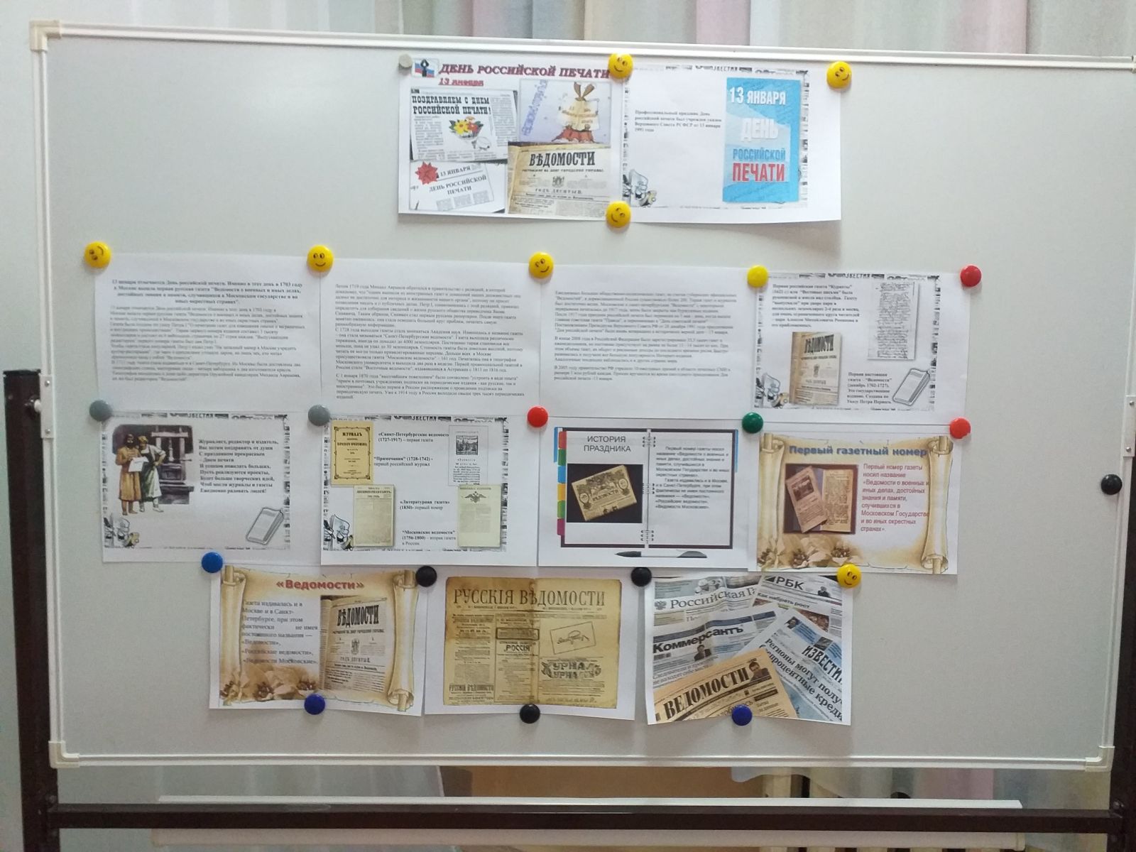 13 января школьным библиотекарем был оформлен информационный стенд, посвященный Дню российской печати. (Установлен в честь выхода первого номера газеты «Ведомости» в 1703 г. Отмечается с 1992 г.).С 1 января 1870 года «высочайшим повелением» было позволено «устроить в виде опыта прием в почтовых учреждениях подписки на периодические издания — как русские, так и иностранные». В России это было первое распоряжение о проведении подписки на периодическую печать, а уже к 1914 году в стране выходило свыше трех тысяч периодических изданий.