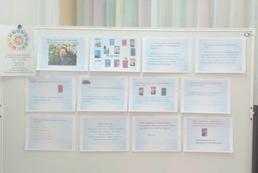 10 марта 80 лет писателю, заслуженному деятелю искусств Республики Татарстан, лауреату Государственной премии Татарстана им. Г.Тукая Фоату Миннахметовичу Садриеву (1941). Учителем родного языка и литературы Якуповой Г.М. был оформлен информационный стенд. Учащиеся познакомились с биографией и произведениями писателя.10 март язучыга, Татарстан Республикасының атказанган сәнгать эшлеклесе, Татарстан Республикасының Дәүләт премиясе лауреатына 80 яшь. Г.Тукай Исемендәге Дәүләт Премиясе Лауреаты Фоат Миннәхмәт Улы Садриевка (1941). Туган тел һәм әдәбият укытучысы Якупова г. м. мәгълүмати стенд әзерләде. Укучылар язучының биографиясе һәм әсәрләре белән таныштылар.