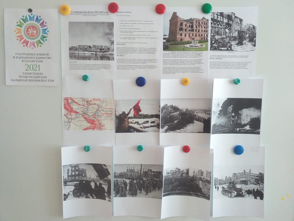 День воинской славы — День разгрома советскими войсками немецко-фашистских войск в Сталинградской битве (1943 год) — отмечается в России ежегодно 2 февраля. Он установлен Федеральным законом № 32-ФЗ от 13 марта 1995 года «О днях воинской славы (победных днях) России». Учителем истории трофимовым Л.В. был оформлен информационный стенд, посвященный этой дате.200 героических дней обороны Сталинграда вошли в историю, как самые кровопролитные и жестокие. При обороне города погибли и были ранены более миллиона советских солдат и офицеров.