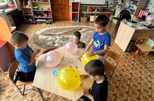 Мы решили поиграть: для этого мы надули шарики, разрезали цветную бумагу на мелкие кусочки и разукрасили шарики в разные цвета с помощью наклеивания бумаги на шарики.
