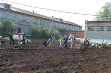 Бүген мәктәп бакчасында эш гөрләде. Укучылар бәрәңге утырттылар. Кишер, чөгендер, суган һәм башка яшелчәләр чәчтеләр. Соңыннан һәйкәл кырыена чәчәкләр утырттылар.