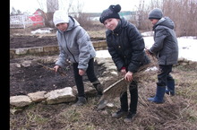 Мәктәп янын җыештыру дәвам итә. 4 класс укучылары да бакчаны җыештырырга чыктылар. Алар чыбык-чабык, кипкән үләннәрне, төрле чүпләрне җыйдылар. Башка класс укучылары да бу эштән читтә калмый.