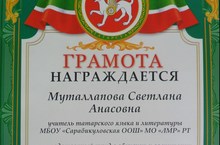 Учитель татарского языка и литературы Муталлапова Светлана Анасовна награждена грамотой МУ "Упраления образования" за плодотворный труд в обучении и воспитании подрастающего поколения, подготовку призеров муниципальных олимпиад и конкурсов.