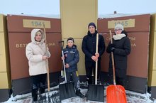 8 класс укучылары мәктәп алдындагы һәйкәлне кардан чистартып карап торалар.