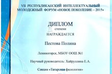 VII Республиканский интеллектуальный молодежный форум "Новое поколение-2015" состоялся 11 декабря на базе Лениногорского филиала КНИТУ им. Туполева -КАИ. Ученица 8 класса Пестова Полина (научный руководитель Хайруллина Е.А.) успешно выступила на конференции и заняла 3 место.