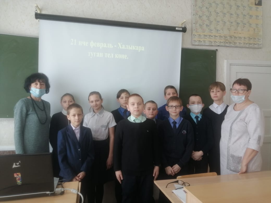 10 нче февраль көнне туган тел укытучылары Гарифуллина Г .М һәм Галеева М ,Ш китапханә хезмәткәре белән Халыкара туган тел көненә багышланган чара үткәрделәр. Укучылар иң элек туган телнең тарихы, байлыгы, матурлыгы, мөһимлеге турында таныштылар, аларга милләтне саклауда зур роль уйнаганы әйтелде. Чара барышында укучылар табышмакларга, кызыклы викторина соруларына җаваплар бирделәр, мәкальләр әйттеләр, ребуслар чиштеләр,төрле биремнәр үтәделәр. С.И.Ожегов һәм В.И. Дальнең аңлатмалы сүзлекләре белән таныштылар. Чара ахырында кызыклы һәм гыйбрәтле видеоролик карадылар.Укучылар чарадан канәгать калдылар.