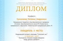 Под чутким руководством Яманаевой Гульфии Шикуровны, ученица МБОУ "ООШ №1" - Ермолаева Наталья Андреевна получила 1 место в Международной интернет-олимпиаде "Солнечный свет". Поздравляем с победой в конкурсе! Желаем не останавливаться на достигнутом результате и стремиться развиваться и познавать все большее. Пусть всегда горит энтузиазм в глазах, и раскрываются возможности. Вперед, к новым победам!
