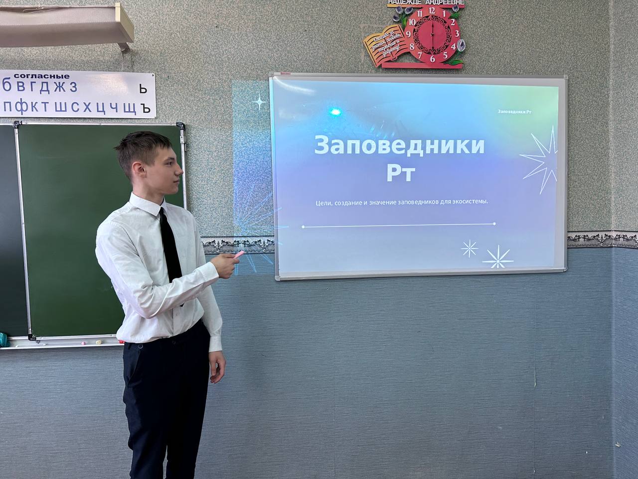 25 апреля среди учащихся 9 класса прошел конкурс презентаций на тему «Заповедные места Республики Татарстан». Учащиеся изучили заповедники Республики Татарстан, расширили и закрепили знания о заповедниках родного края и их практическом значении. Были подведены итоги тематической недели «Биология в школе».