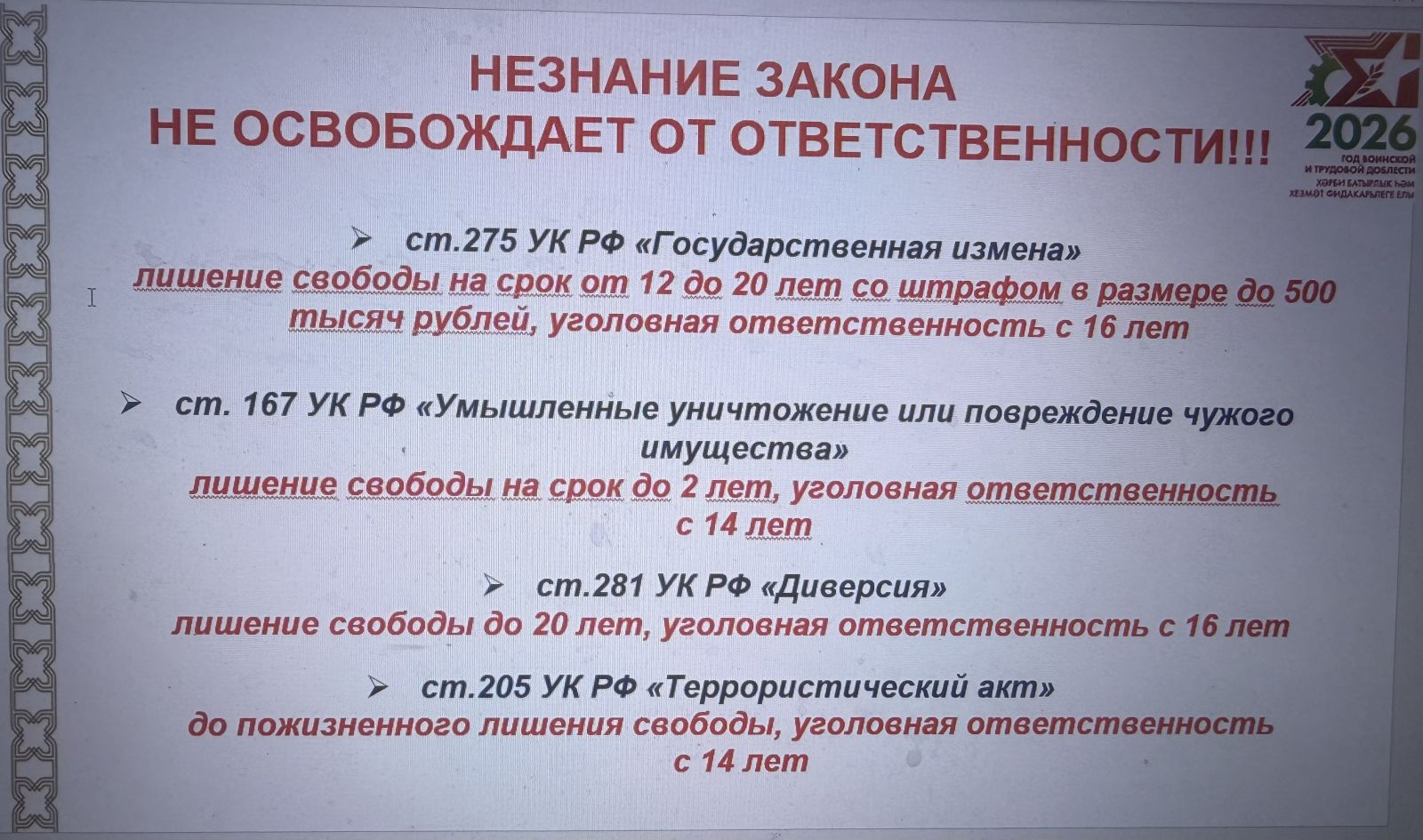 За распространение среди детей и молодежи деструктивных движений, субкультуры массовых убийств, в том числе идеологии «Колумбайн», травли, суицидальных проявлений предусмотрена уголовная ответственность (ст. 167, 205, 275, 281) от 10.02.2026 № ЛФ-12-38 Министерство образования и науки Республики Татарстан.