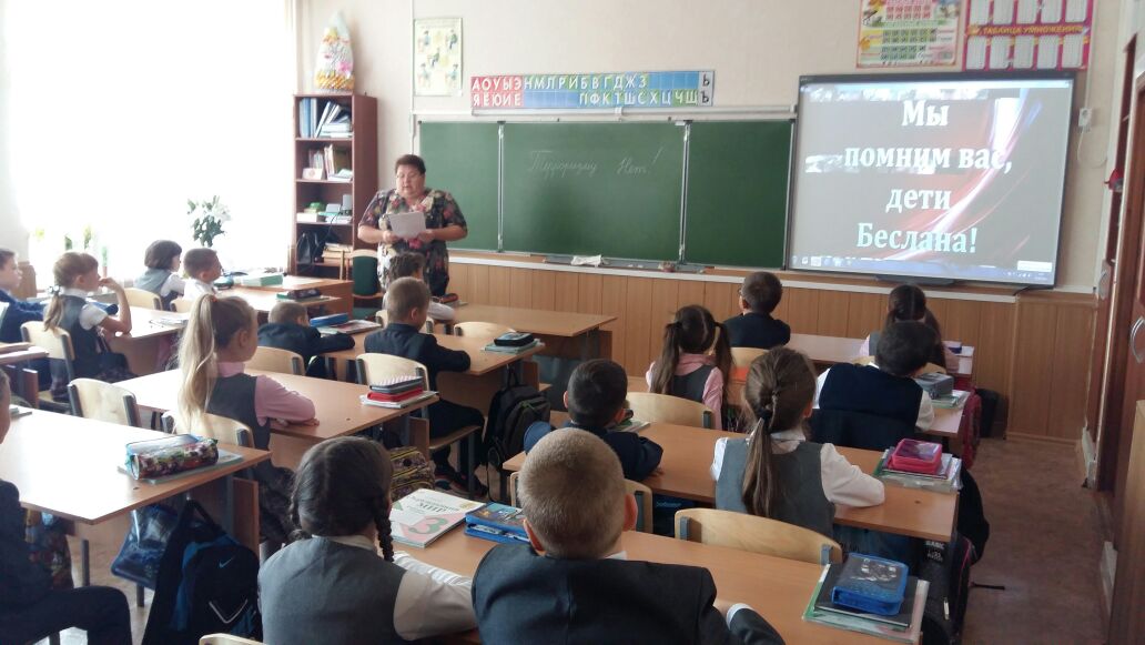 Затем учащиеся вспомнили события, произошедшие 1-3 сентября 2004 года в Бесланской школе, посмотрели видеофильм "Когда мужчины плачут..." о простых людях, которые выносили под пулями из горящей школы детей, как они рисковали своими жизнями ради спасения невинных душ. Также учащиеся узнали о "Городе Ангелов"- мемориальном кладбище, где похоронены жертвы этого теракта - 186 детей, которым не суждено было закончить школу. .