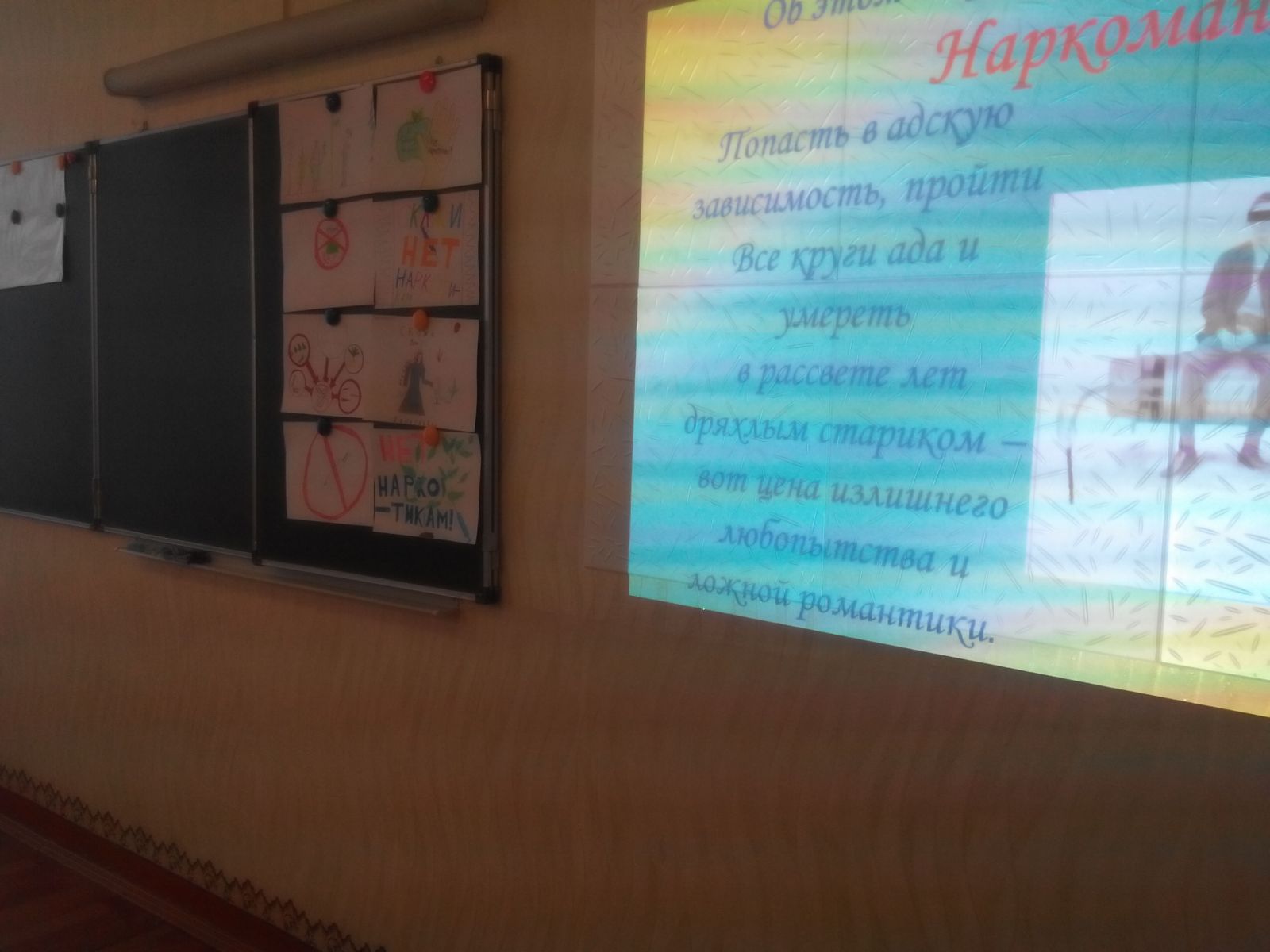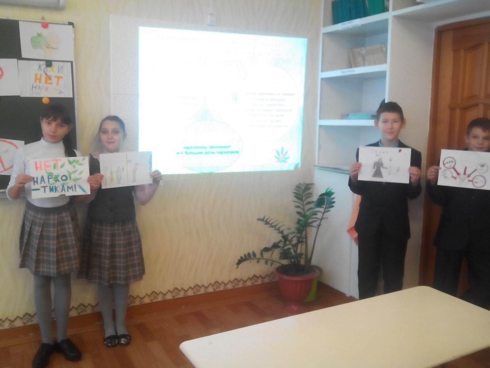 В связи с этим 11 ноября в 5 А классе был проведен классный час на тему «Сообщи, где торгуют смертью». Учащиеся посмотрели презентацию «Жизнь без наркотиков», о вреде немедицинского употребления наркотических средств, а так же об ответсвенности за их незаконный оборот. Все дети принимали активное участие в беседе о вреде психотропных веществ и наркотическов. Была организована выставка рисунков «Нет наркотикам!»