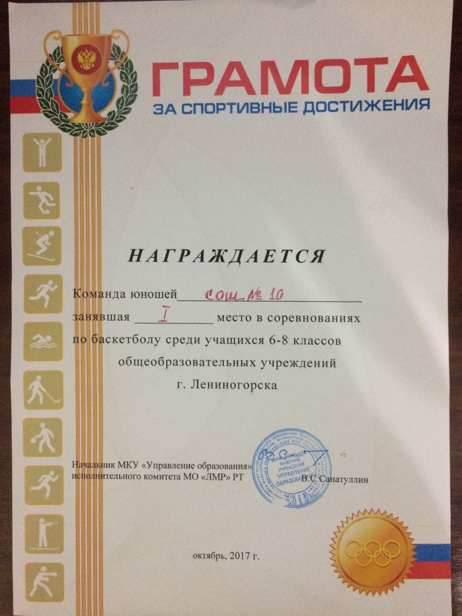 Опубликовано: 26.10.2017С 23.10 – по 26.10.2017г. прошли соревнования, первенство по баскетболу среди учащихся 6-8 классов на базе СОШ №4. Команда мальчиков в составе: Куприянова Александра 8Б кл., Павлова Сергея 8Б кл., Сухановского Артема 8Б кл., Тихонова Антона8Б., Белоусова Даниила 8Б кл., Суркова Ильи 7А кл., Савченко Романа 7А кл., заняла 1 место. Команда девочек в составе: Таракановой Владиславы 7А кл., Безруковой Юлии 7Б кл., Безруковой Марии 7Б кл., Павловой Дарьи 7Б кл., Тазиевой Индиры 7Б кл., Безлепкиной Татьяны 7Б кл., заняла 2 место. Всех участников поздравляем с победой! Молодцы!!!