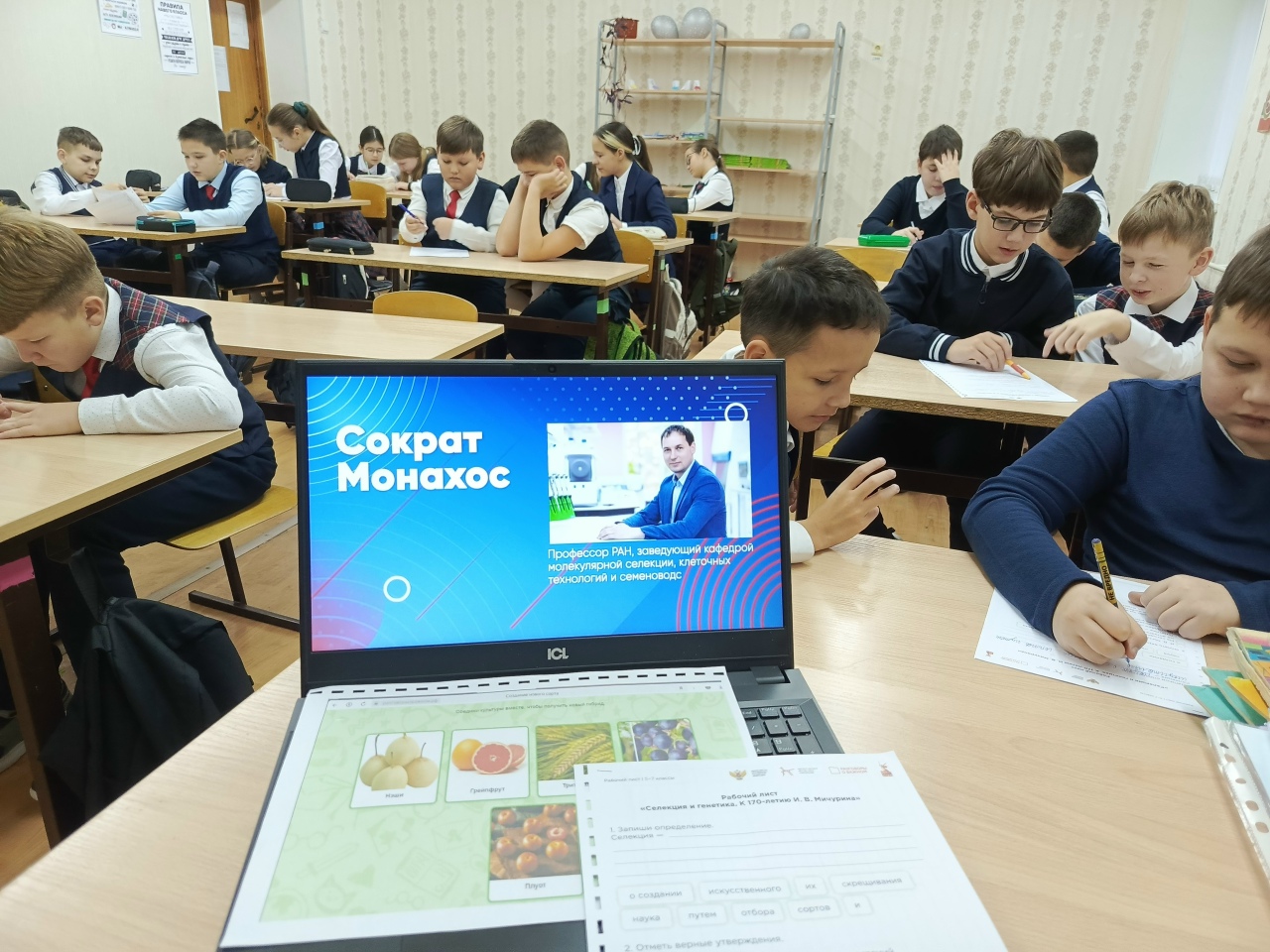 Сегодня, 10 ноября, пятиклассники приняли участие во внеурочном занятии, посвящённом 170-летию со дня рождения Ивана Владимировича Мичурина. Урок прошёл под темой «Селекция и генетика». Ребята познакомились с основами науки селекции растений и узнали о значительном вкладе выдающегося учёного-биолога И.В. Мичурина в развитие сельского хозяйства нашей страны.