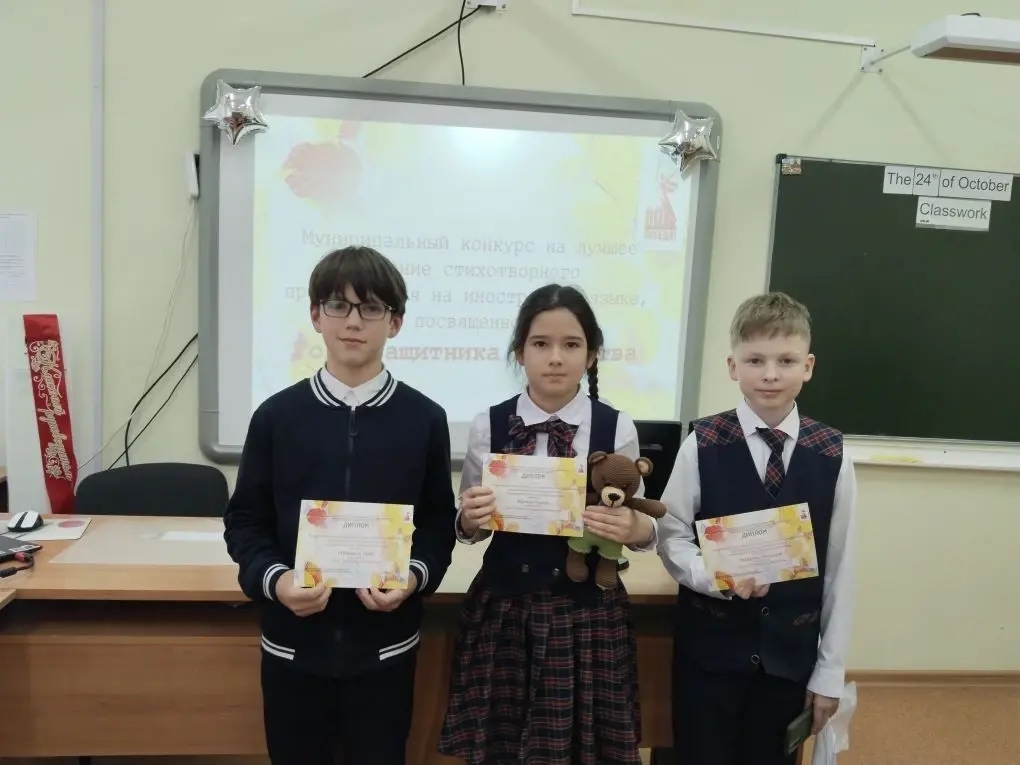 Муниципальный конкурс на лучшее прочтение стихотворного произведения на иностранном языке. 3 место- Зайруллина Лия(2кл) , Портнова Азалия - 2 место (3кл), Мусина Ралина - 2 место, Гинванов Таир-3 место, Рыбалко Виталий -3 место