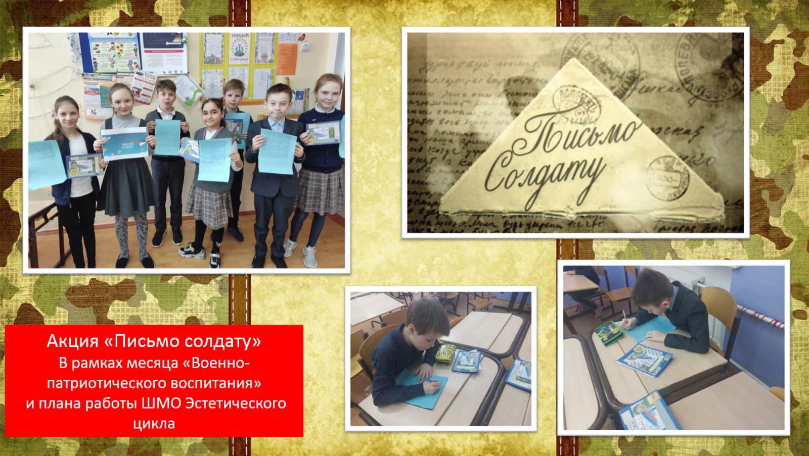 В преддверии праздника День защитника Отечества в школе проведена акция «Письмо солдату». Ребятам было предложено написать письма выпускникам нашей школы, кто сейчас проходит срочную службу в частях российской армии. Учащиеся 5 класса сделали красивые открытки своими руками и написали письма.