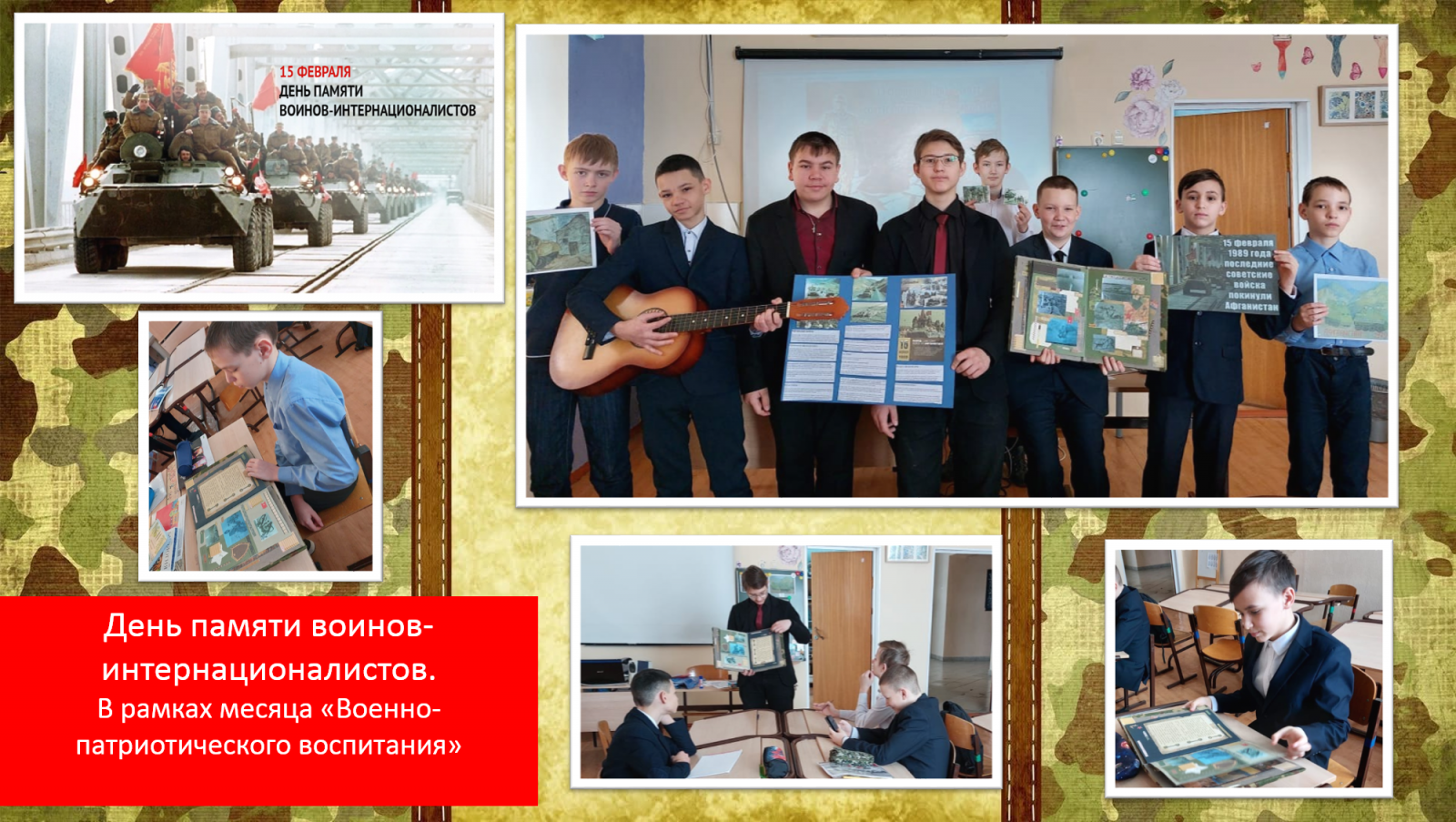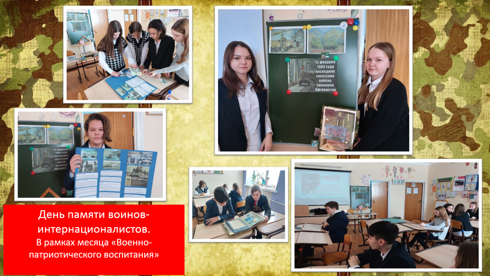 В целях гражданско-патриотического воспитания молодежи, повышения статуса защитника Отечества, формирования нравственной позиции были проведены памятные мероприятия, посвященные Дню вывода Советских войск из Афганистана. Для россиян эта дата стала Днем памяти воинов–интернационалистов. С учащимися 7 и 8 класса были проведены тематические часы мужества. Эти мероприятия воспело боевое прошлое сынов России, которые до конца выполнили свой интернациональный долг. Учащиеся узнали о причинах ввода советских войск в Афганистан, о мужестве и отваге советских воинов, о трудных условиях, в которых приходилось воевать и о помощи, оказываемой советскими воинами местным жителям. 15 февраля 1989 года последняя колонна советских войск покинула территорию Афганистана. Это событие ознаменовало для Советского Союза окончание Афганской войны, которая унесла жизни более 15 тысяч советских солдат. Этот день, начиная с 2011 года, ежегодно отмечается 15 февраля.