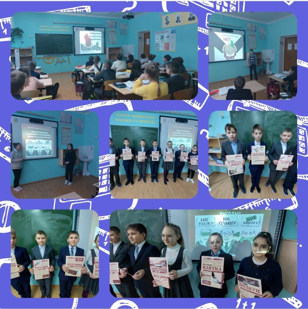 4 классе прошел классный час «Что такое коррупция?» В ходе занятия велась беседа о коррупции, о признаках коррупции и причины возникновения коррупции. Ребята разыграли сценку «Коррупция». Также учащиеся нарисовали рисунки, как символ, изученный темы. В завершении мероприятия ученики сделали вывод, что знания о коррупции могут помочь в будущем, для того, чтобы себя обезопасить. Классный час прошел плодотворно, учащиеся были активны.