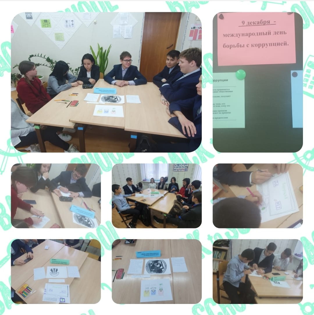 В 8 классе (классный руководитель Миннахметова Л.И.) провела классный час в виде конкурса: «Вместе против коррупции». Во время конкурса рассмотрели отдельные возможные случаи коррупции и обсудили меры по нейтрализации или минимизации проявлений коррупции. Работу организовали в малых группах в форме состязания команд. Каждая команда имела свое название и девиз. При ответе на вопросы членам других команд можно была задавать вопросы, делать уточнения.