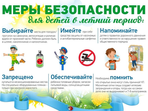 Обеспечить безопасность детей летом – в первую очередь задача родителей. Основные причины гибели детей на воде в первую очередь оставление их без присмотра (умение плавать не гарантирует безопасность), а также купание в не оборудованных, запрещенных местах.