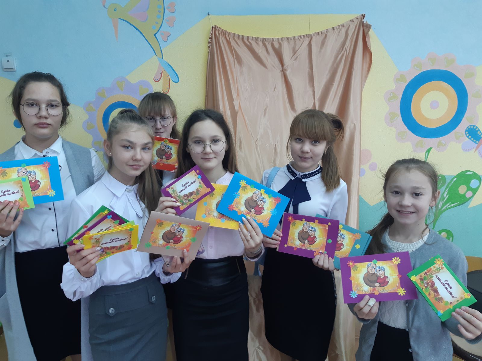 Поздравительные открытки были сделаны учащимися 8 и 7 класса под руководством учителя искусства Сергеевой А.В. Обучающимся сделаны лаконичные и корректные фразы, которые разместились на «облаках» и использовались классами.