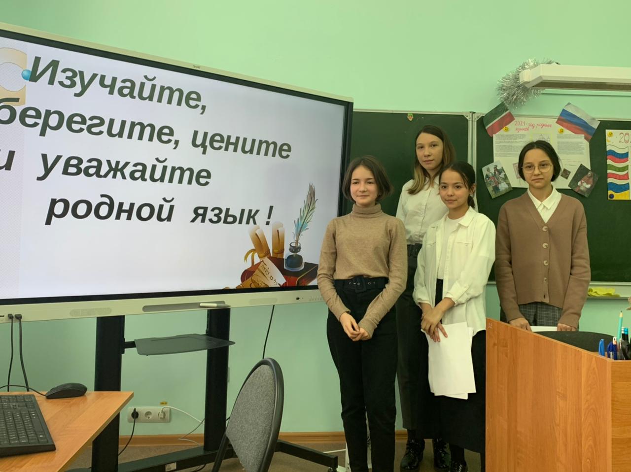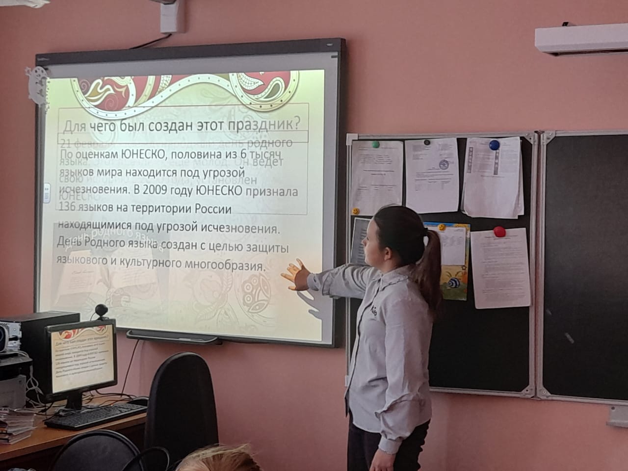 В этот же день учащиеся 7 “В” под руководством Елены Геннадьевны Ильмуковой самостоятельно подготовили и провели внеклассное мероприятие на тему “История возникновения праздника “День родного языка”. Познавательныя презентация, увлекательная викторина активизировали в учащихся живой интерес к данному вопросу.