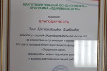 Благотворительный фонд "Татнефть" программа "Одаренные дети" выражает благодарность директору школы Платоновой Ольге Константиновне за содействие в организации и проведении IV Слета призеров благотворительного фонда "Татнефть" "Одаренные дети ".