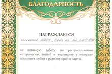 Особое внимание в нашей школе уделяется гражданско-патриотическому воспитанию и образованию. Проводятся встречи с ветеранами Великой Отечественной войны, уроки мужества, Дни воинской славы и т.д. Школьники активно участвуют в различных конкурсах, научно-практических конференциях на патриотическую тематику. Поэтому неслучайно на днях коллектив школы получил благодарность за активную работу по распространению исторических знаний и воспитанию у молодого любви к родному краю и народу. Благодарность подписана председателем Общества краеведов РТ, первым заместителем Председателя Всероссийского общества татарских краеведов, академиком АВИН РФ Бурхановым А.А.