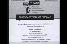 С 12 по 18 апреля 2014 года на базе компьютерного лагеря «Байтик» наши учащиеся Вердян Анжелика, Габидуллина Риана, Ризванов Айнур, Хайрутдинов Ильнар, Закиев Марсель, Булгаков Михаил и Закиров Ильдус приняли участие в профильной смене «Программирование на C#» в рамках республиканского проекта «IT-Jump». В программу смены входили различные тренинги, публичные защиты проектов, мастер-классы ведущих специалистов и экспертов ИТ-сферы, успешных бизнесменов.