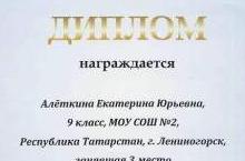 Поздравляем ученицу 9Б класса Алеткину Екатерину (учитель Наталья Александровна Богданова), занявшую 3 место на Межрегиональной предметной олимпиаде КФУ по дисциплине «Обществознание». 06.04.2012