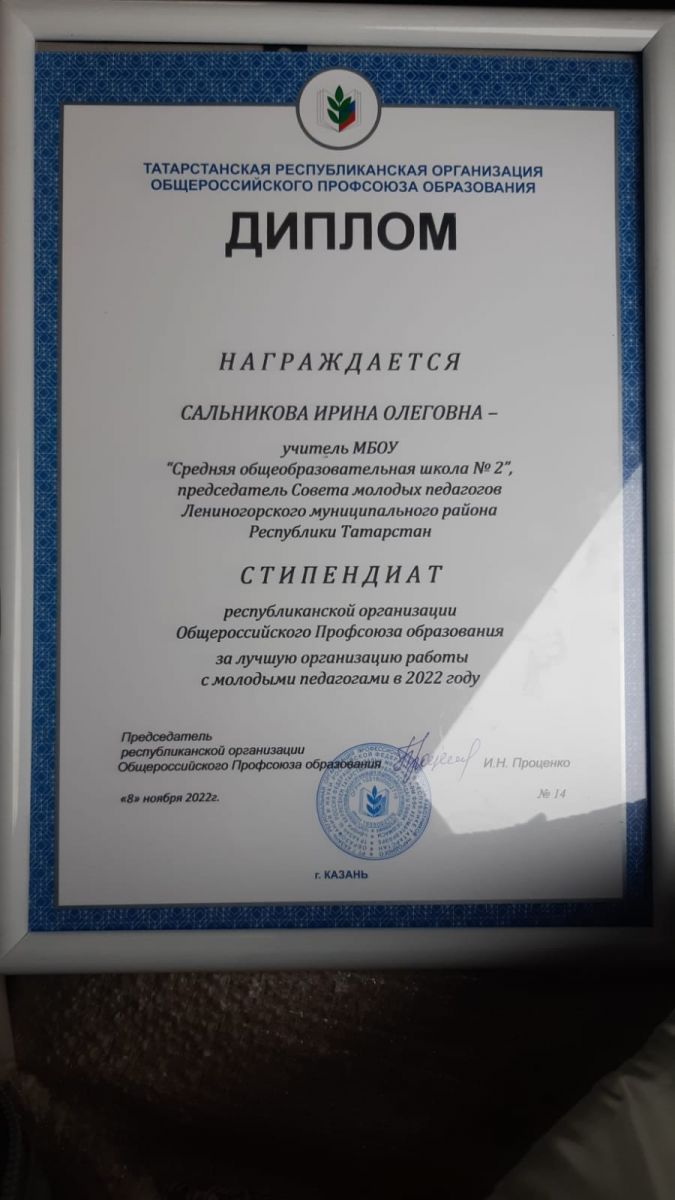 Опубликовано: 01.12.2022Сальникова Ирина Олеговна, учитель иностранных языков, по совместительству - председатель Совета молодых педагогов Лениногорского муниципального района Республики Татарстан, стала Стипендиатом республиканской организации Общероссийского Профсоюза образования за лучшую организацию работы с молодыми педагогами в 2022 году. Желаем дальнейших успехов!