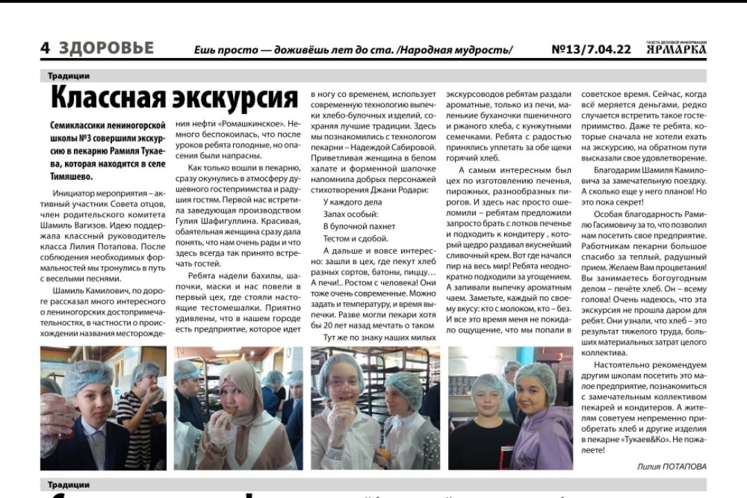 Тестом и сдобой.А дальше и вовсе интересно: зашли в цех, где пекут хлеб разных сортов, батоны, пиццу… А печи!.. Ростом с человека! Они тоже очень современные- можно задать и температуру, и время выпечки. Разве могли пекари хотя бы двадцать лет назад мечтать о таком? Тут же по знаку наших милых экскурсоводов ребятам раздали ароматные, только из печи, маленькие буханочки пшеничного, ржаного хлеба, с кунжутными семечками. Ребята не ожидали такого угощения и с радостью принялись уплетать за обе щеки горячий хлеб.Но самым интересным был цех по изготовлению печенья, пирожных, разнообразных пирогов. И здесь нас просто ошеломили своим гостеприимством работники пекарни. Ребятам предложили запросто с лотков брать печенье и подходить к кондитеру , который щедрой рукой кондитерским шприцом намазывал на печенье или бисквит вкуснейший сливочный крем. Вот где начался пир на весь мир! Ребята забыли о своем возрасте- как никак 14 лет, все-таки- и неоднократно подходили за угощением. А закончилось все ароматным чаем, и, заметьте, предложили каждому по вкусу: кому с молоком, кому –без.И все это время меня не покидало ощущение, что мы попали в прошлое, советское время. В наше время, когда все меряется деньгами, редко случается встретить такое гостеприимство. Даже те ребята. которые вначале не хотели ехать на экскурсию, на обратном пути высказали свое удовлетворение от поездки.Хочется поблагодарить Вагизова Шамиля Камиловича за такую замечательную идею, за предоставление транспортных услуг. А сколько еще у него планов!!! Но это пока секрет!Особая благодарность Рамилю Гасимовичу Тукаеву за то, что позволил нашим ребятам посетить свое предприятие. Работникам пекарни большое спасибо за теплый , радушный прием. Желаем Вашей пекарне процветания! Вы занимаетесь богоугодным делом – печёте хлеб. Он- всему голова!Очень надеюсь, что эта экскурсия не прошла даром для ребят. Они узнали, что хлеб – это результат тяжелого труда, больших материальных затрат целого коллектива пекарни.Настоятельно рекомендуем другим школам города и района посетить это малое предприятие, познакомиться с замечательным коллективом пекарей и кондитеров. А жителям нашего города непременно приобретать хлеб и другие изделия в пекарне в селе Тимяшево. Не пожалеете!P.S. А 7 апреля 2022 года в 13 номере газеты «ЯРМАРКА» в разделе «Здоровье» про нас напечатали статью «Классная экскурсия»!Ребята с большим удивлением и удовольствием увидели себя в СМИ. Думаю, что и родителям наших 7-миклассников будет также приятно узнать на фотографиях своих детей. -