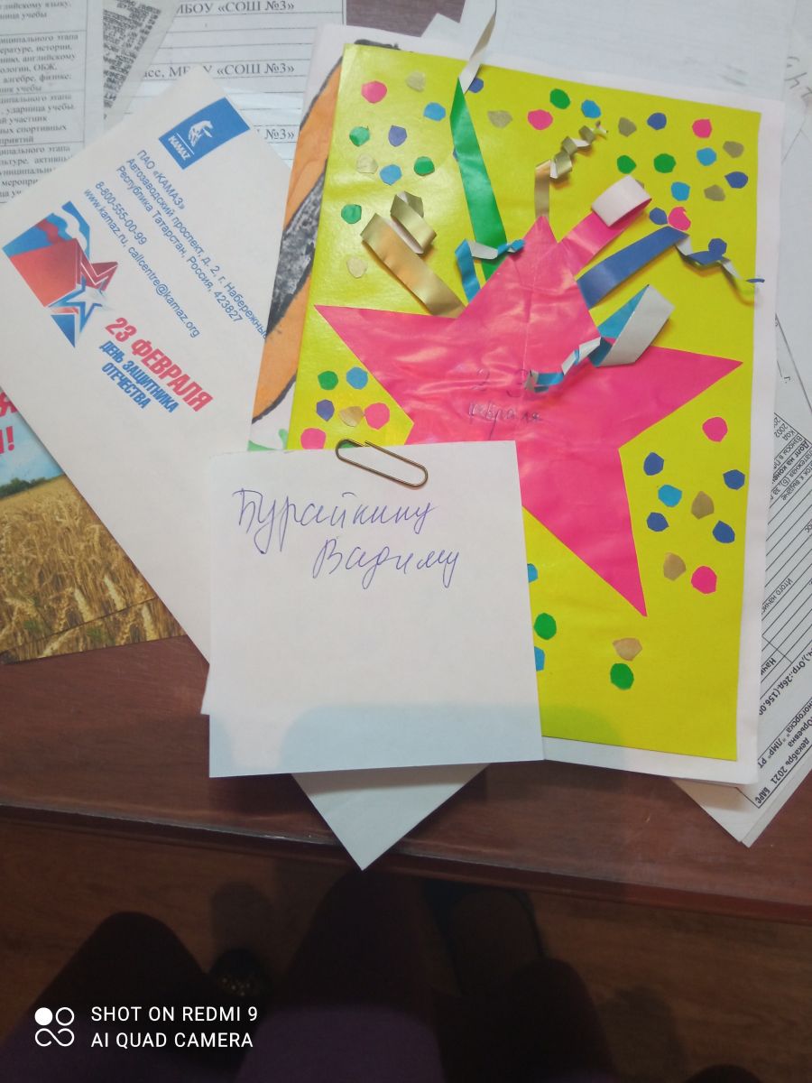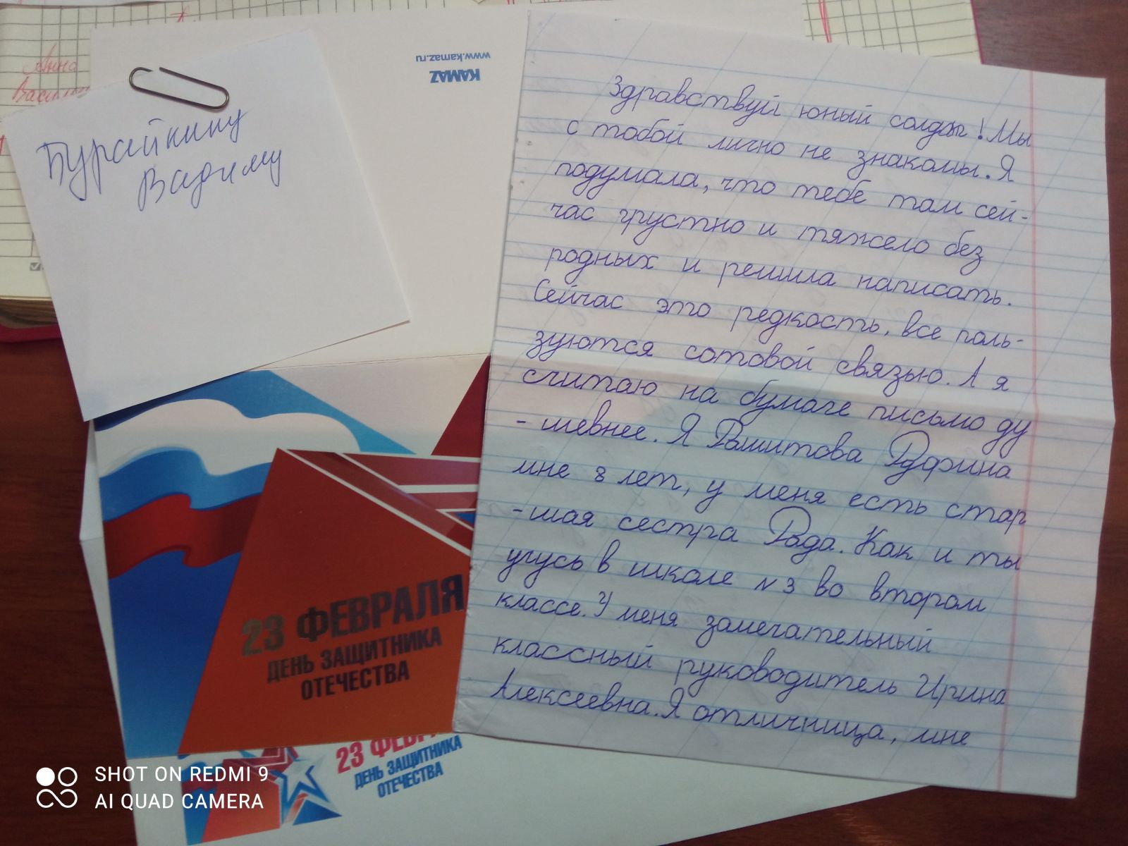 Лениногорская автошкола ДОСААФ РТ совместно с Военным комиссариатом г. Лениногорска и Лениногорского района ежегодно проводит акцию «Письмо солдату», посвящённую Дню защитника Отечества! Эта акция е проводится ежегодно, начиная с 2017 года.Цель акции – поздравить юношей г. Лениногорска и Лениногорского района, в настоящее время проходящих службу в рядах вооруженных сил РФ, с Днем защитника Отечества, поддержать ребят, проявить о них заботу.Задачи:-формировать в подрастающем поколении положительную мотивацию к прохождению воинской службы в рядах вооруженных сил РФ.-совершенствовать знания школьников о праздниках, связанных с военной тематикой;-формировать в школьниках активную жизненную позицию, чувство коллективизма, патриотизма, сплоченности.Из нашей школы МБОУ «СОШ №3» сейчас в рядах российской армии проходят службу наши выпускники:1. Бурайкин В. Е.; 2. Кузьмин А. Е.; 3. Сафин А. Я..Поэтому И. А. Аникина, а именно она является первой учительницей наших солдат, организовала эту акцию в своем 2 классе СОШ №3.Ребята написали письма солдатам, сделали своими руками поздравительные открытки, даже положили по шоколадке каждому бойцу в конверт.Открытки также сделали и другие ребята начальных классов. В городе проходит муниципальный конкурс рисунков и открыток на тему «Есть такая профессия - Родину защищать!». Поэтому в школе организована обширная выставка детского творчества, а лучшие открытки будут представлять нашу школу на муниципальном уровне. Все ребята молодцы! Но конкурс - есть конкурс. Самые лучшие работы удостоены I ,II и III места. Спасибо всем огромное за активное участие в этой акции: и ученикам, и их родителям, и учителям! -