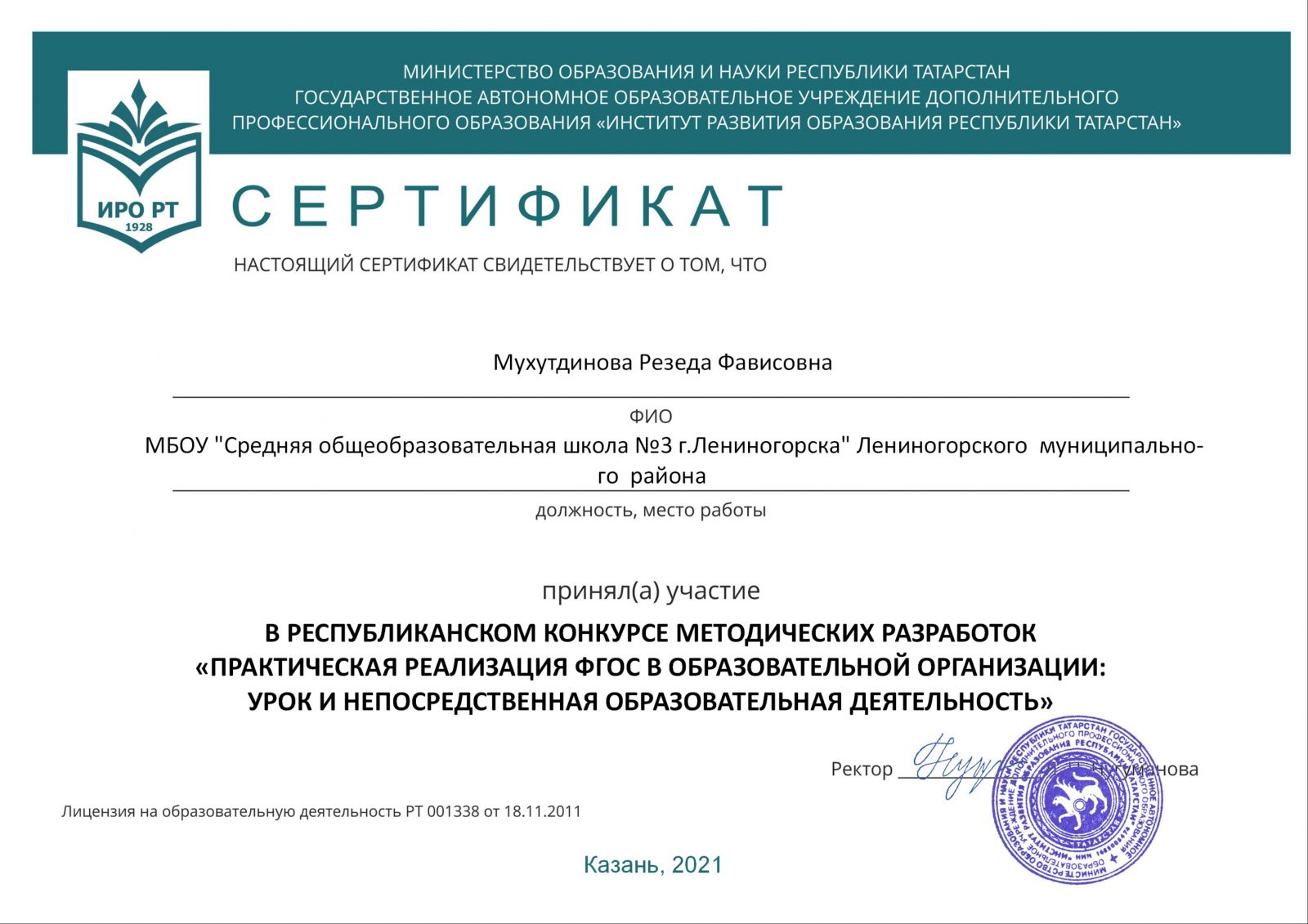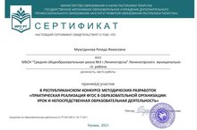 С целью повышения профессионального мастерства педагогических работников; обобщения и распространения инновационного опыта работы педагогических работников был объявлен республиканский конкурс методических разработок «Практическая реализация ФГОС в образовательной организации: урок и непосредственная образовательная деятельность» (приказ ГАОУ ДПО ИРО РТ № 507 от 08.10.2021г.). Учитель татарского языка и литературы Мухутдинова Р.Ф.приняла участие. -