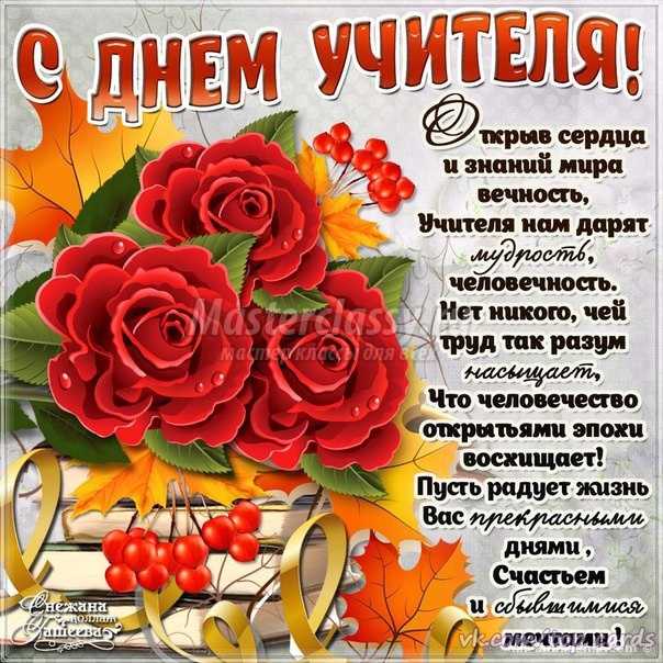 Самые теплые и искренние поздравления с Днем учителя! Желаем вдохновения, терпения, искренних улыбок учеников, благодарности от родителей. Пускай вдохновенно начинается каждый новый день. Будьте здоровы, дорогой учитель, наставник, мудрый советчик. Спасибо за знания, опыт и душевное тепло.