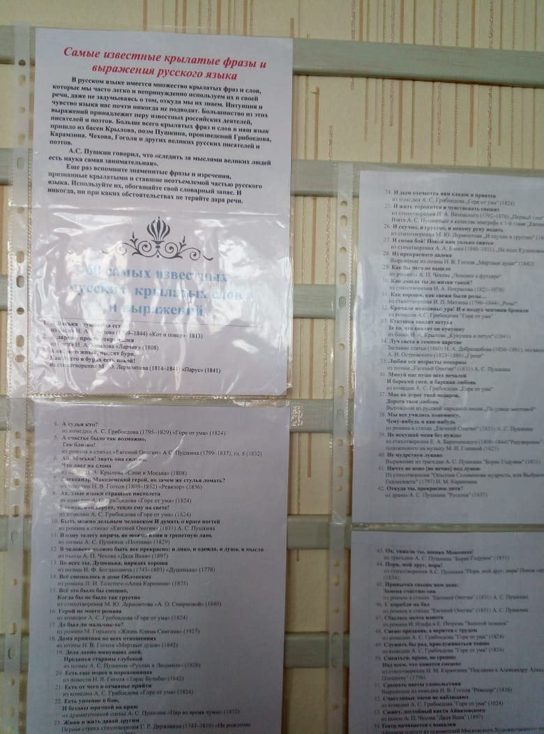 Рус теле hәм әдәбият атналыгы тәмамланды. Бу вакыт әчендә укучылар укытучы белән "Эдипләр-фронтовиклар", "Рус теле турында кызыклы фактлар", әдәби әсәрләрдән алынган "Иң танылган фразалар" дип аталган информационно стендлар әзерләделәр.Завершилась Неделя русского языка и литературы. В течение этого времени учащиеся вместе с учителем подготовили информационные стенды "Писатели-фронтовики", "Самые знаменитые крылатые фразы", взятые из произведений художественной литературы, "Занимательные факты о русском языке". -