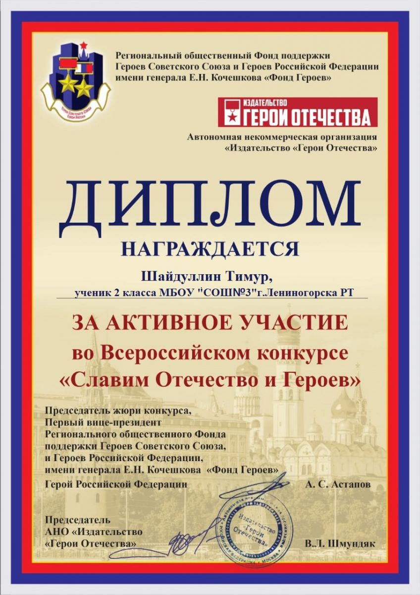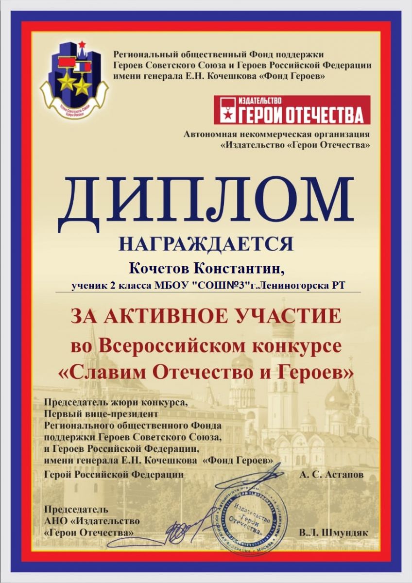 С целью воспитания у молодого поколения уважения к героям Отечества и чувства любви к Родине Фонд Героев имени генерала Е.Н. Кочешкова и АНО "Издательство "Герои Отечества" проводил творческий конкурс "Славим Отечество и Героев", приуроченный ко Дню Героев Отечества. Учащиеся 2 класса приняли участие в номинации «Музы поэзии подвиги славят». -