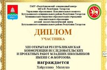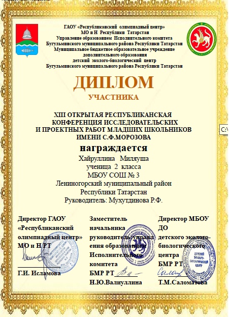 С целью развития интереса к изучению природы родного края, исследовательской деятельности у школьников 1 - 5 классов, привлечения внимания детей к природному, историческому и национальному наследию своей местности, воспитания бережного отношения к природе муниципальным бюджетным образовательным учреждением дополнительного образования «Детский эколого-биологический центр Бугульминского муниципального района Республики Татарстан» при поддержке ГАОУ «Республиканский олимпиадный центр» Министерства образования и науки Республики Татарстан, Управления образования Исполнительного комитета Бугульминского муниципального района Республики Татарстан была проведена XIII открытая республиканская конференция исследовательских и проектных работ младших школьников им.С.Ф.Морозова. На этой конференции приняла участие учащаяся 2 класса Хайруллина М.